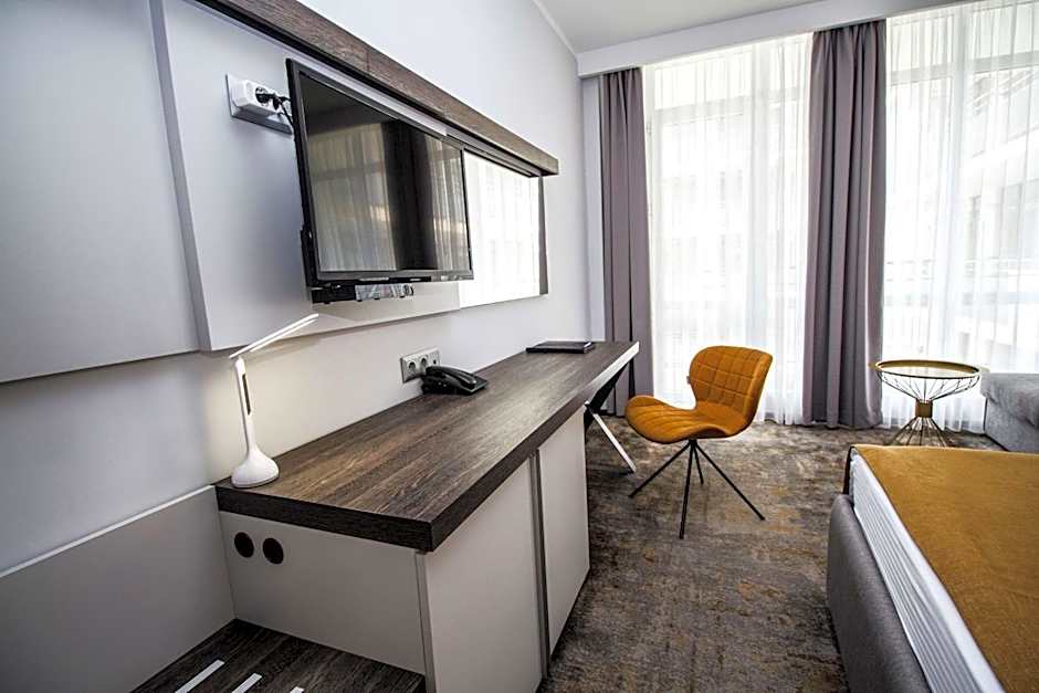 This Suite offers the comfort of having a 138 ft² space with an extra room for relaxing with a large desk. There is a bedroom with a king size bed, a living room, a fully equipped mini-bar, toiletries by Geneva Guild, rain shower, 2 LED TVs with more than 50 international channels, high speed WiFi, free safety deposit box, central air conditioning, an electrical kettle set and a balcony.