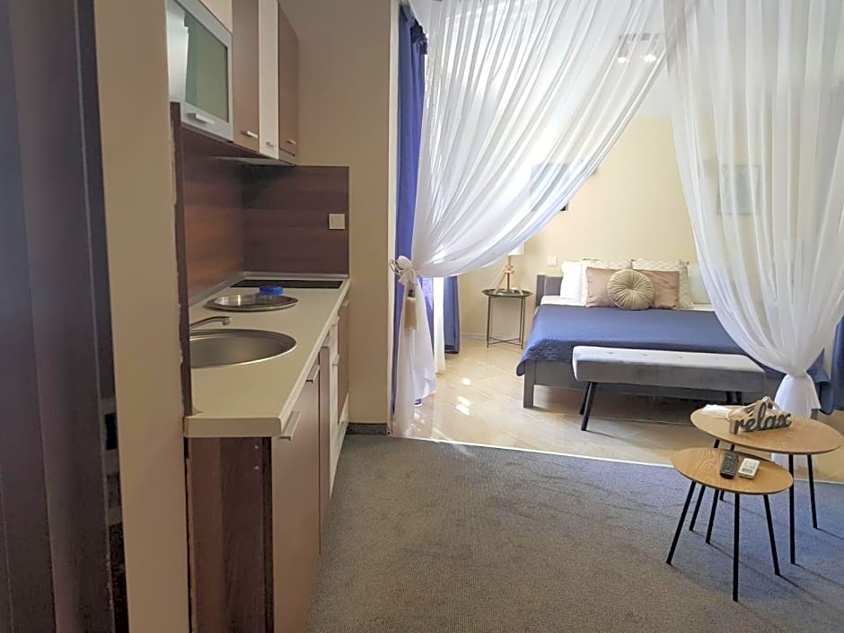 The studio is luxuriously furnished with designer furniture. The studio has a large bed, a wardrobe, a sofa chair, air conditioning, LCD TV, dressing table and a fully equipped kitchenette with fridge, cooking facilities and utensils. The studio has a terrace equipped with garden furniture table and chairs.