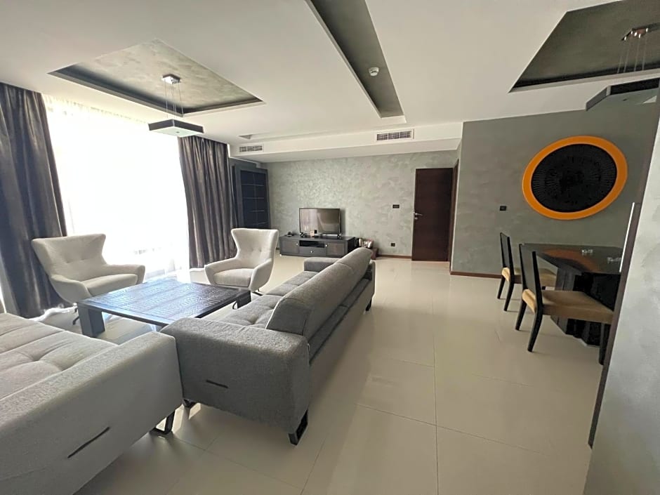 Two-bedroom design apartment with a spacious living room, dining area and a large terrace.