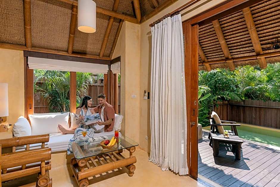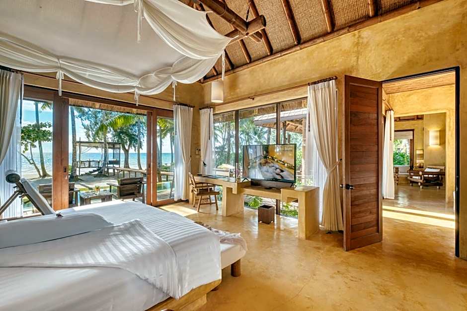 This spacious beachfront villa features a private plunge pool and sun decks.The living room is fitted with a bamboo seating set, a 42-inch flat-screen TV and 2 desks. Private bathroom is equipped with a separate bathtub, a rain shower and double sinks.