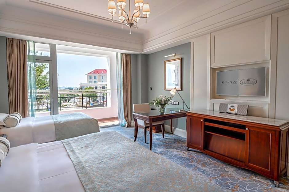 Room features a seating area, private balcony, and an private bathroom.