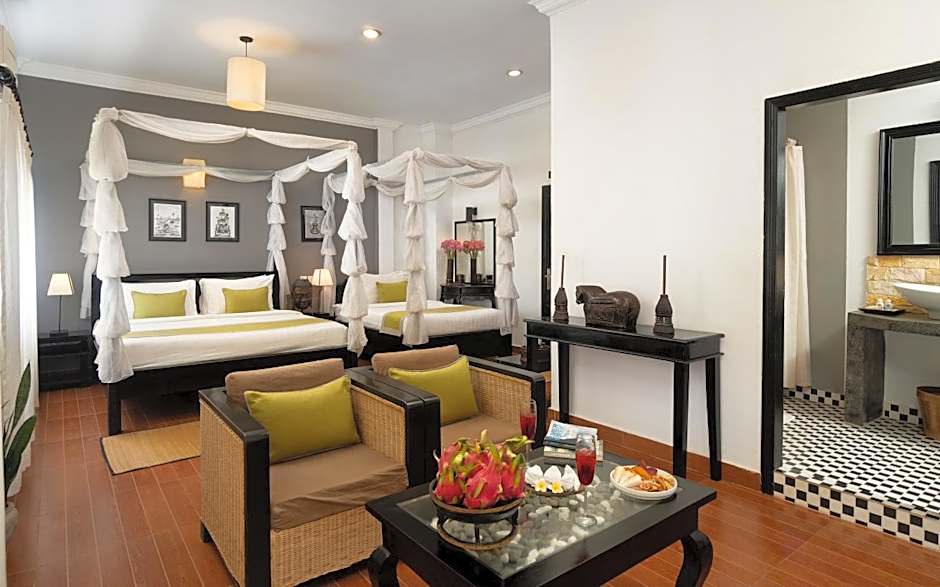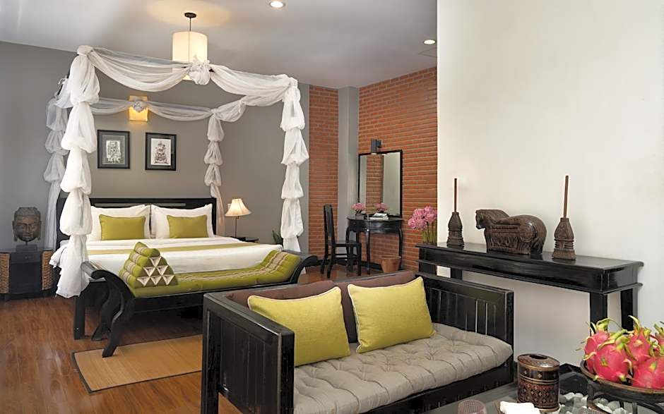 Step into a room steeped in traditional charm, where handcrafted wooden accents, locally woven textiles, and Khmer-inspired design celebrate Cambodia’s heritage. This air-conditioned sanctuary blends authenticity with modern comforts: a sleek work desk, a dining area, a well-stocked mini-bar, and an electric kettle for your convenience. The private bathroom includes free toiletries, bathrobes, a hairdryer, a bathtub, while complimentary tea/coffee facilities and eco-conscious water refill stations (plastic-free!) keep you refreshed.