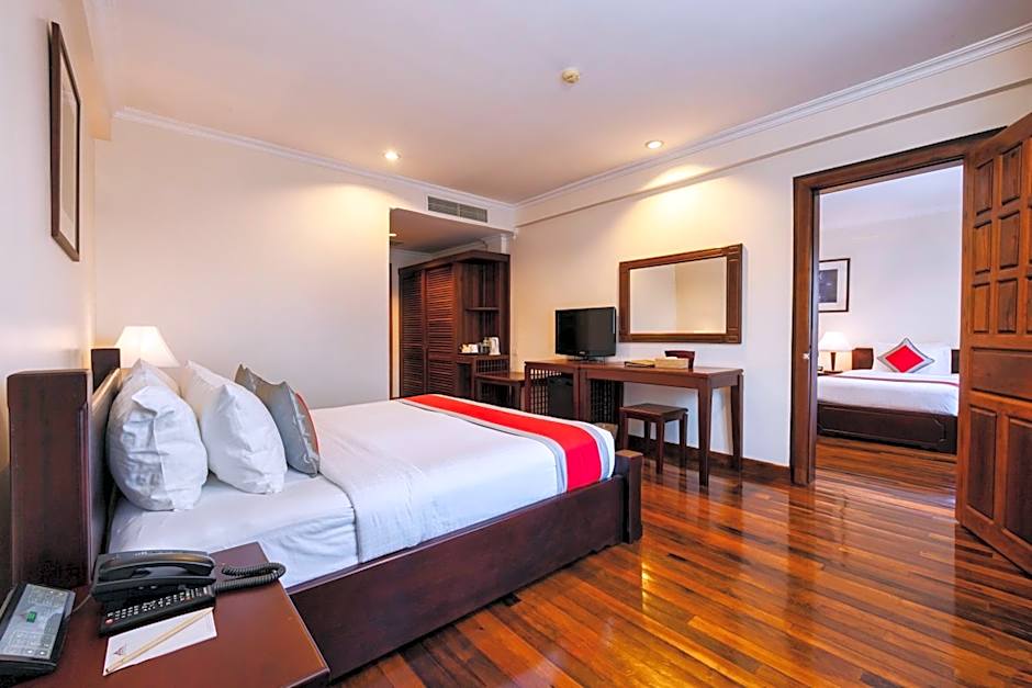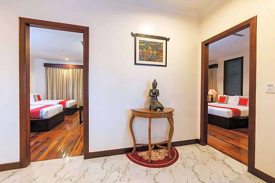 The Saem Siemreap Hotel offers a variety of rooms, including Family Suites, Cabana King Rooms, Deluxe Double or Twin Rooms with Pool View, 2-Bedroom Deluxe Connecting Rooms, and Deluxe Double or Twin Rooms. All rooms are non-smoking and can accommodate 3 to 6 adults. The bed sizes range from Queen to King to Twin, with some rooms featuring sofa beds. Room sizes vary, with the largest being 969 sqft.