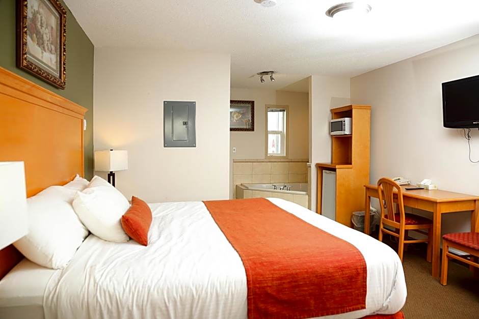 This honeymoon suite features a king bed and a spa bath tub. A mini refrigerator, microwave, and a flat-screen TV.