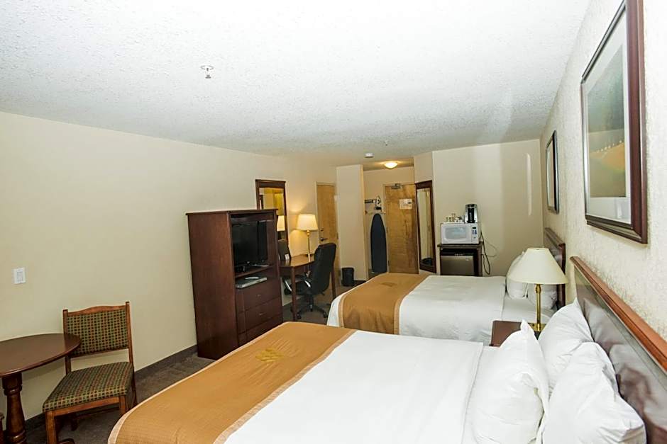 The Lakeview Inns & Suites in Chetwynd offers Queen Rooms with Two Queen Beds that are non-smoking. These rooms are classified as Family rooms and have a room size of 312 sqft. They can accommodate 4 adults and 2 children, and each room is furnished with 2 double beds.