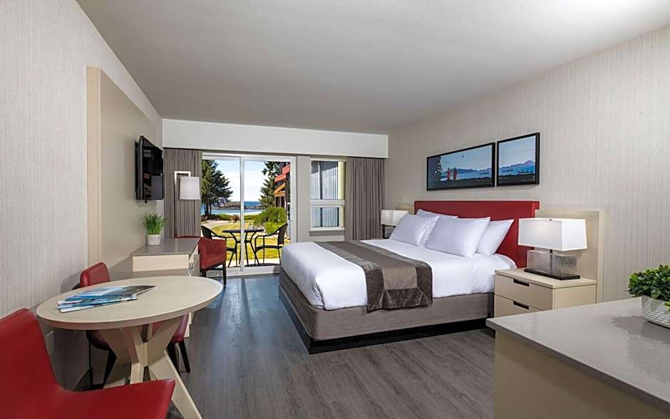 This room features an LCD TV, a microwave, mini refrigerator, kitchenware. A sofa bed is also provided. Upper floor rooms offer views of Mackenzie Beach from the balcony. This room offers a patio, over looking the ocean and Mackenzie Beach.