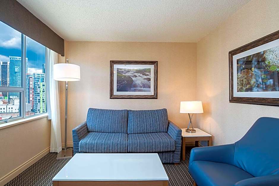 This suite offers a separate bedroom and living room with sofa bed. Views from Vancouver city center are available from the balcony. 55" and 42" flat-screen TVs are included. This room features a microwave, refrigerator, complimentary in-suite tea and coffee, and three telephones with free local calls and voicemail services.