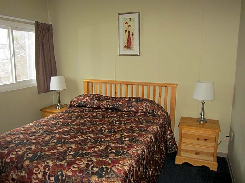 This suite features a queen bed, and the front room offers a double bed. A kitchenette with a microwave, coffee maker and refrigerator is provided.
