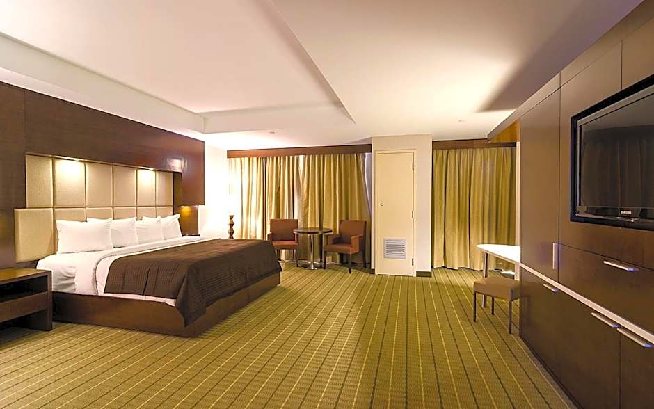 The Hotel Casino New Nouveau Brunswick offers a variety of room types including luxury suites, king suites, deluxe king rooms, deluxe queen rooms with two queen beds, and studios. All rooms are non-smoking and can accommodate two adults. The room sizes range from 441 to 797 square feet. Beds vary between king size and queen size beds, with some rooms also featuring a sofa bed.