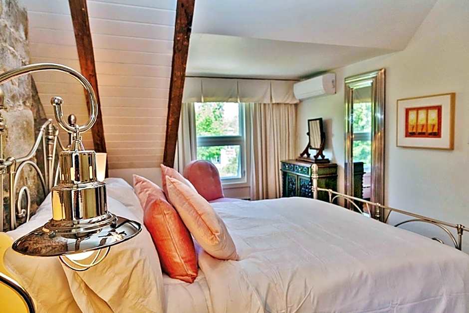 Fitted with stone walls and wood beamed ceilings, this split-level suite offers a jetted tub and a seating area with fireplace. It features a full kitchen with a granite counter top and breakfast bar. Views of the St. Lawrence River are provided from various windows in the unit. This room type is also known as the Greystone Suite.