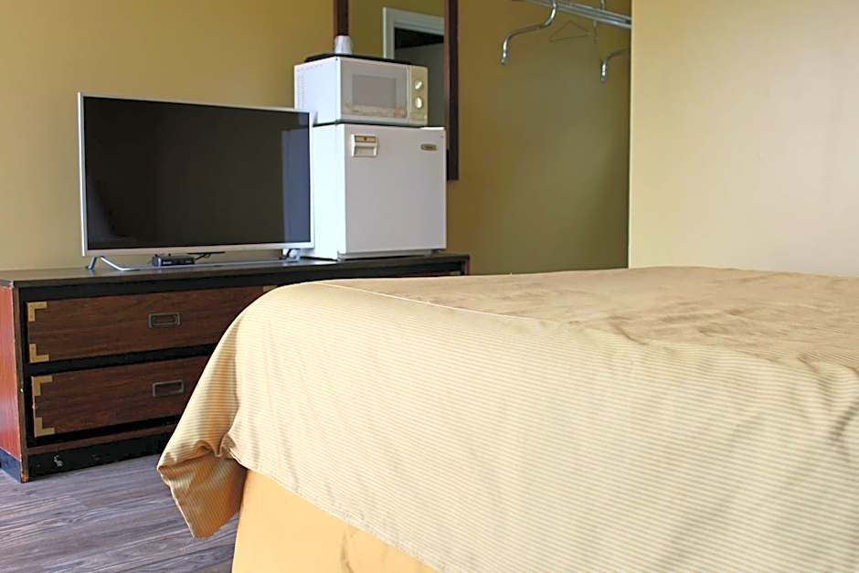This room has a flat-screen TV, microwave and air conditioning.