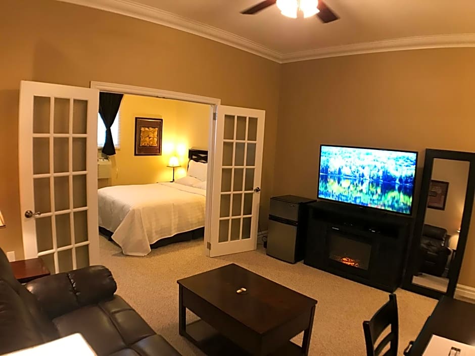 This suite has a sofa bed in a separate living space. Amenities include a fireplace and free in-room movies.