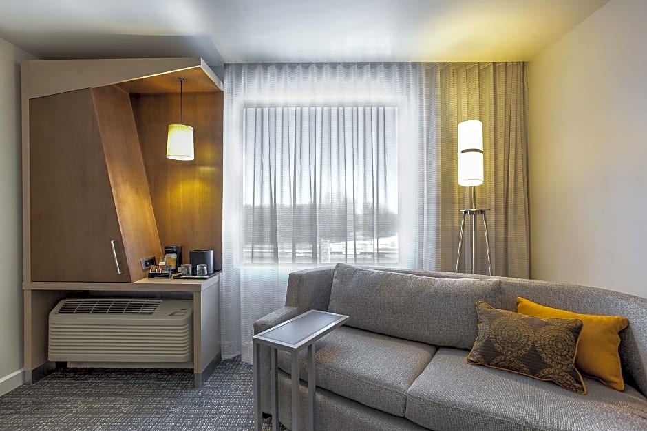 This suite features a living room with a sofa and flat-screen cable TV. There is also a mini-fridge, microwave and coffee maker.
