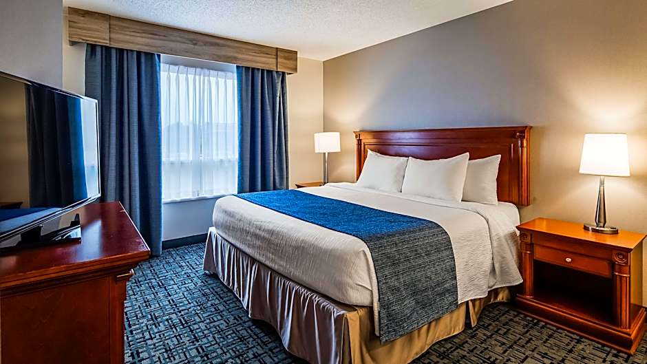 The Best Western Hotel Brossard offers a variety of rooms including Queen Rooms with Two Queen Beds, King Suites with Sofa Beds, and King Rooms with Sofa Beds. All rooms are non-smoking and accommodate up to 4 adults and 3 children. Room sizes range from 280 sqft to 646 sqft, and bed sizes include Queen and King size beds as well as Sofa Beds.