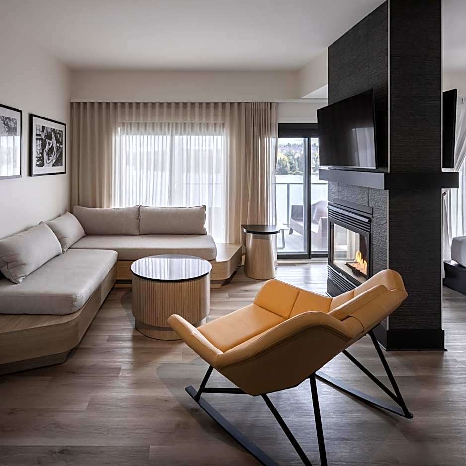 This suite features a patio door that leads to a private balcony overlooking Lake Masson or Lake Dupuis. A double-sided fireplace can be enjoyed from both the bedroom and living room. It includes one double daybed, 2 LCD TVs, an iPod docking station and a kitchenette.