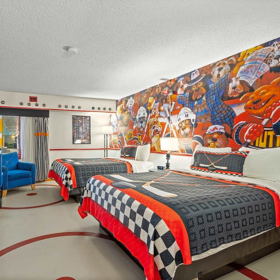This hockey-themed room features free WiFi, a TV with HD channels and a Keurig coffee maker.