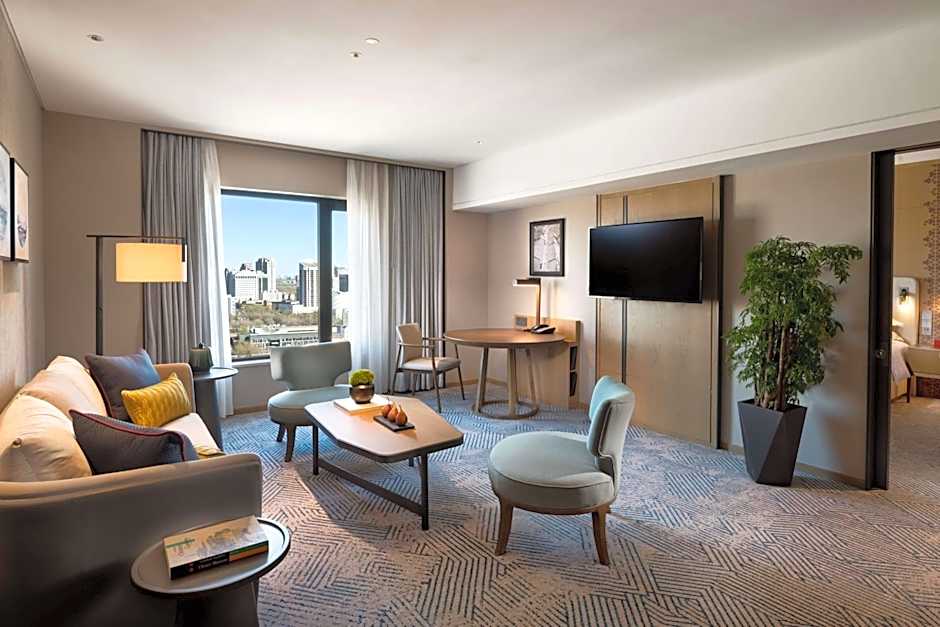 Spacious and elegant, rooms feature a seating area and large windows offering views of the city.