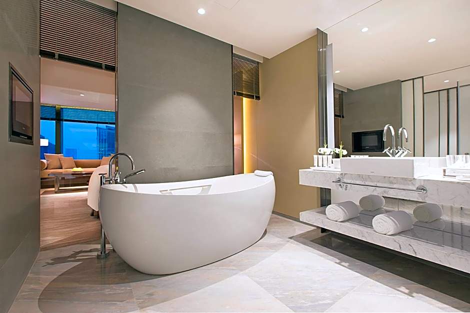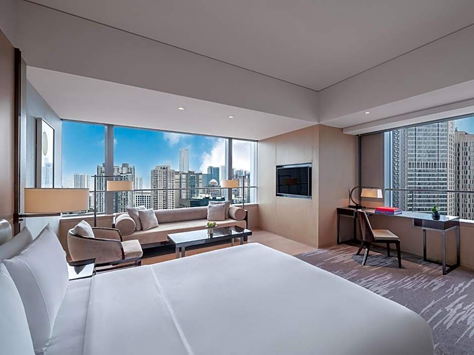 This room is located between the 9th and the 25th floors, offering optimal views of Da Ci Temple and commercial district. With discreetly screened windows, the bathroom with a bathtub and intimate vanity area receives an abundance of natural light. It also comes with 500 thread-count linen sheets, customized Italian-branded bathroom amenities and toweling.