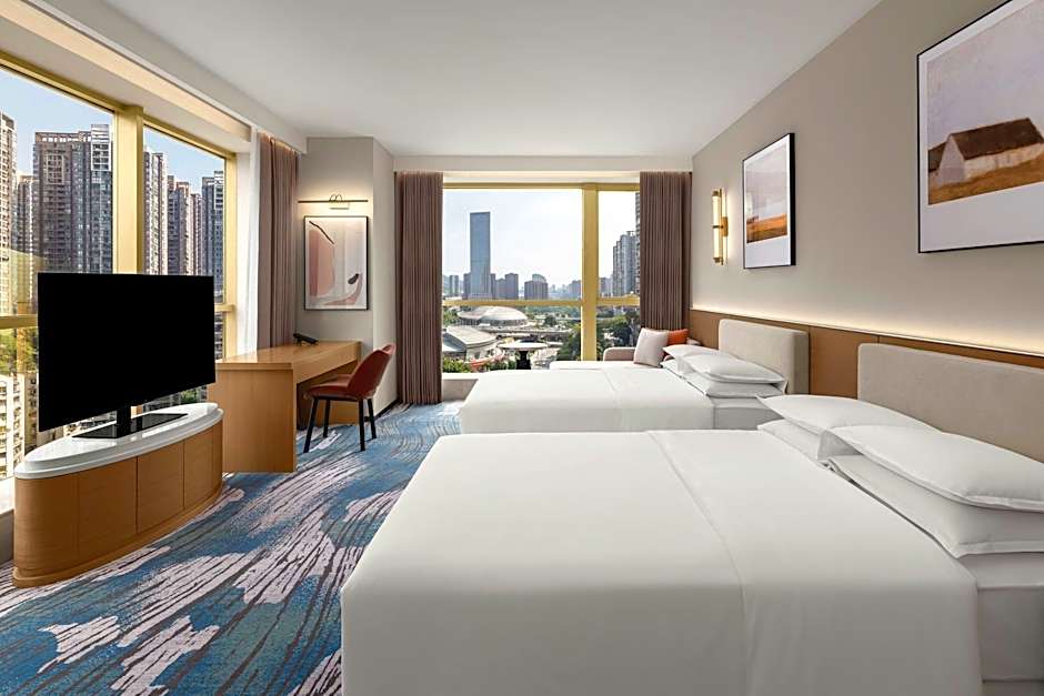 The Sheraton Chongqing Hotel offers a variety of rooms including Double and Twin types, accommodating 2 adults with no children. Most rooms feature a King size bed, with bed sizes varying based on the room type. Smoking is not allowed in any of the rooms. Room sizes range from 344 sqft to the spacious 969 sqft Executive Suite.