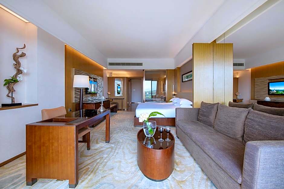 Spacious suite offers a balcony with lake views. It has a spacious living room, a kitchen with dining area, a bedroom with king-size bed as well as a bathroom with TV, separate walk-in rainshower and spa bath. An open kitchenette, walk-in closet and guest washroom are prvovided. It also comes with HD TV system with cable, DVD player, fax machine, refreshment bar, coffee machine. Premiere Lounge access is available as well.