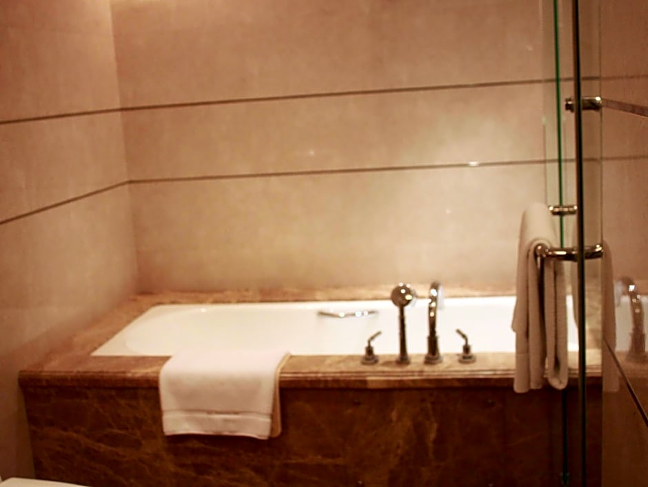 Spacious suite a separate lounge area with comfortable sofa set, ample desk space and a private bathroom with a bathtub.