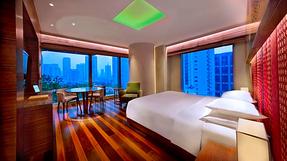 The stylish and spacious suite is located on the 26th floor. It offers a King-sized bed and views of Xintiandi entertainment area or Huaihai Road shopping street. The bathroom includes floor heating, a separate electronic toilet and a Typhoon shower. It comes with an iPod docking station, unlimited local calls, daily newspaper and a mini-bar.