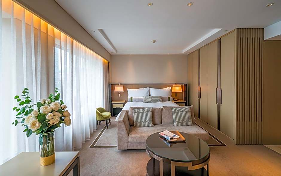 Boasting city or river views, this soundproofing suite comes with a living room, 2 bedrooms and 2 bathrooms. The master bedroom is fitted with a queen-sized bed, while the 2nd bedroom is fitted with 2 single beds. One of the bathroom has a TV. Extras feature double-glazed windows, washing machine, dining area and dressing room. The full-equipped kitchen has a stovetop, oven and kitchenware.