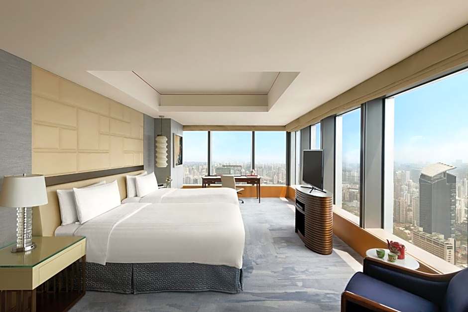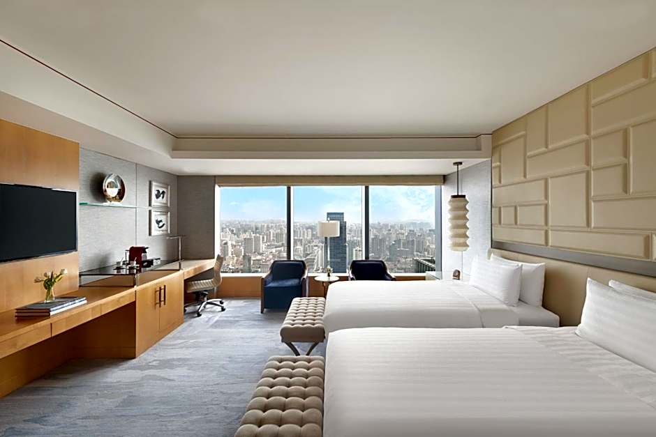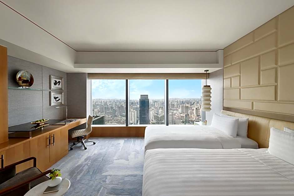 Deluxe Twin Room features floor to ceiling windows offering clear views of Shanghai, marble bathroom with floor heating for optimal comfort, separate bathroom and toilet, and branded toiletries.