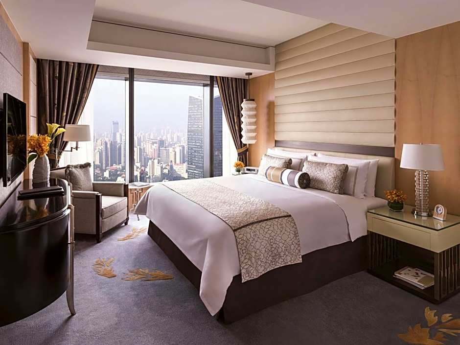 Deluxe Room features floor to ceiling windows offering clear views of Shanghai, marble bathroom with floor heating for optimal comfort, separate bathroom and toilet, and branded toiletries.