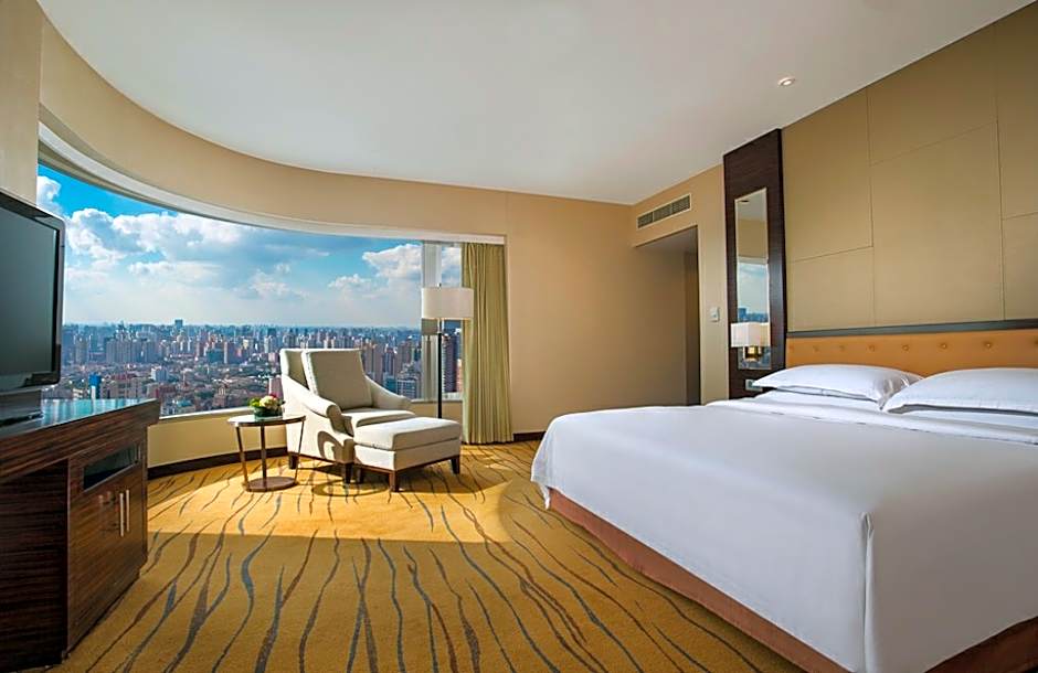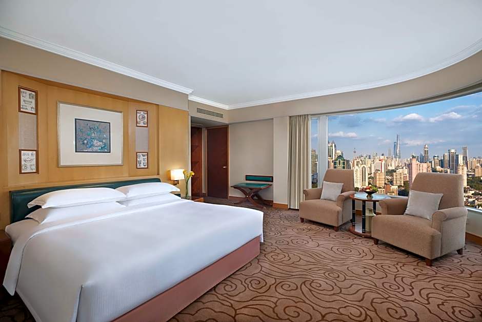 This spacious room features over-sized windows overlooking Shanghai skyline and Oriental Pearl Tower. Guests can enjoy city views and get to work at the large desk, or relax in the armchair.