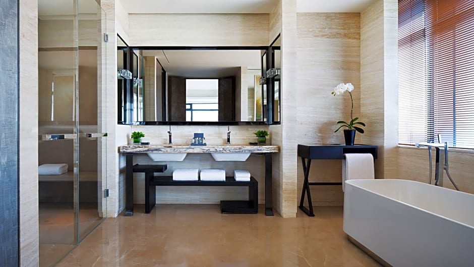Covering 156-square-yard with wooden floors, this decorated modern and luxurious guest room features views of the city or Qingnian Park through angled floor-to-ceiling windows. It features a king-size bed, a 46-inch flat-screen TV, a living room with dining area and internet access. The walk-in shower and deep soaking tub await in the 2 cream-colored marble bathrooms. Guests also enjoy the access of Grand Club.