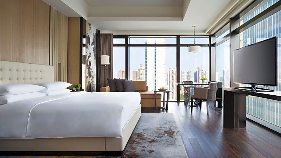 Covering 115 square yard with wooden floors, this decorated modern and luxurious guest room features views of the city or Qingnian Park through angled floor-to-ceiling windows. It features a king-size bed, a 46-inch flat-screen TV and internet access. The walk-in shower awaits in the cream-colored marble bathroom. Guests also enjoy the access of Grand Club.