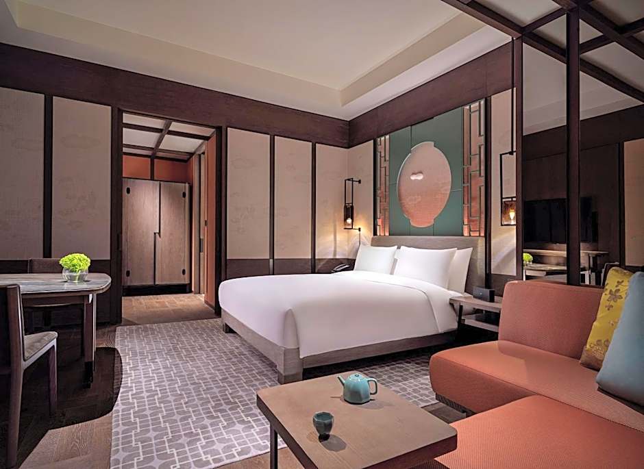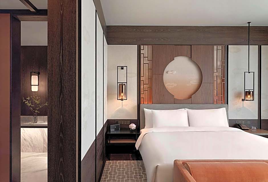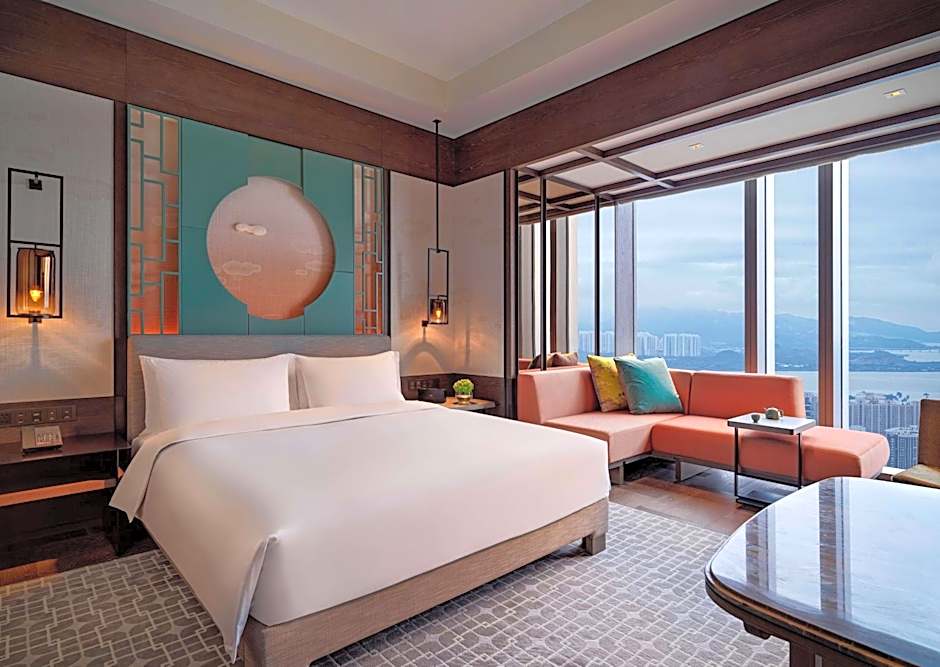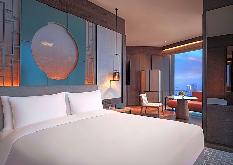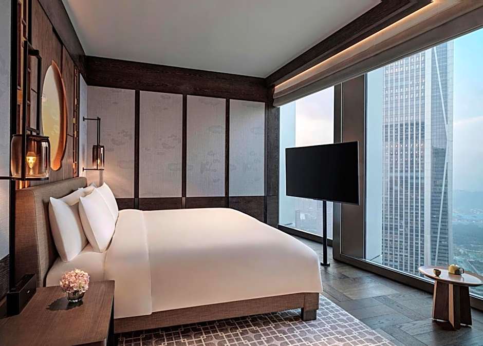 48 sq m room fitted with floor-to-ceiling windows and panoramic views of the Shenzhen skyline, it features one king bed, distinct dressing zone separated by French sliding doors. The hotel guestrooms epitomize functional luxury, providing sophisticated residential comfort away from the demands of urban life. Enjoy complimentary soft drinks from the mini-bar on the first day of each stay;