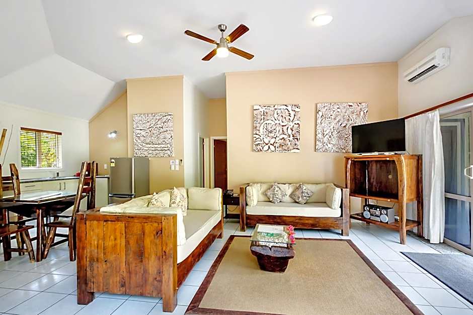 This villa features a large deck with outdoor furniture and direct access to the beach and turquoise lagoon. There is a 2-post king bedroom, a large fully equipped kitchen and lounge room with flat-screen TV, DVD and CD player. The spacious bathroom includes a shower, vanity and toilet.