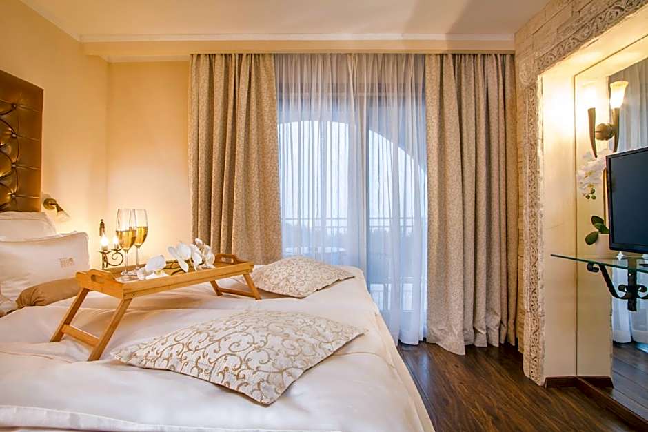 Most elegant and spacious suite with 2 bedrooms, living room with a bar and fireplace, spa bath and large balcony.