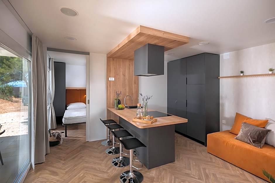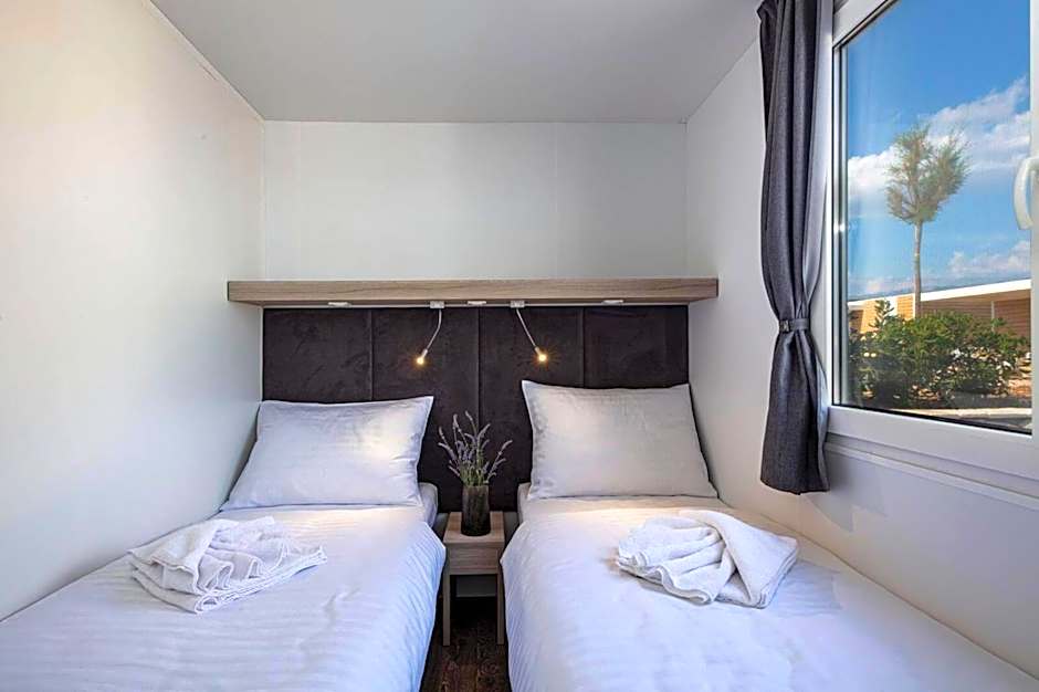 Featuring a private entrance, this air-conditioned mobile home consists of 1 living room, 2 separate bedrooms and 2 bathrooms with a shower and a hairdryer. Meals can be prepared in the kitchen, which comes with a stovetop, a refrigerator, a dishwasher and kitchenware. Boasting a terrace with sea views, this mobile home also provides soundproof walls and a flat-screen TV with satellite channels. The unit offers 4 beds.