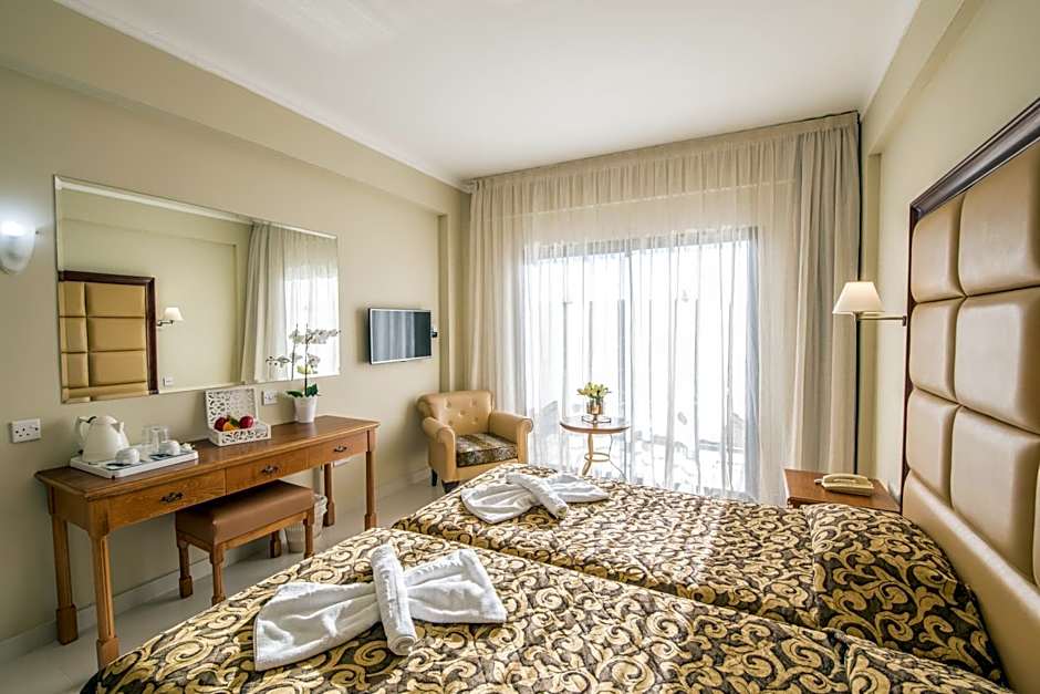 Guests at Tsokkos Gardens Hotel can enjoy a range of featured amenities, including free parking, both indoor and outdoor swimming pools, and a kids' pool for the little ones. The hotel also offers a free kids' club, a fitness center, and a relaxing garden area. With air conditioning included in the room rate, guests can stay cool and comfortable during their stay. For those looking to explore further, amenities such as a tennis court and sauna are available for an additional charge.