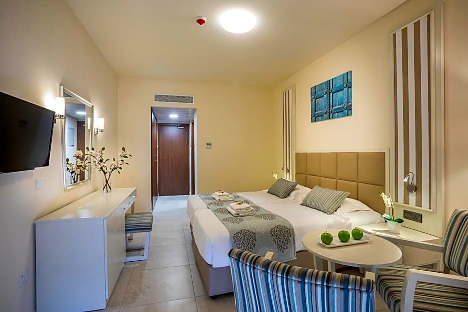 The Aquamare Beach Hotel & Spa offers a variety of rooms including Standard Double or Twin Rooms with Sea View, Executive Suites with Sea View, Superior Double or Twin Rooms with Sea View, Deluxe Double Rooms with Sea View, Superior Double Rooms with Inland View, Standard Double or Twin Rooms with Inland View, and Family Suites with Inland View. The rooms can accommodate 2 adults and either 1 or 2 children, depending on the room type. Smoking is not allowed in any of the rooms. The bed sizes range from Twin and Queen size beds, with some rooms also offering a sofa bed option.