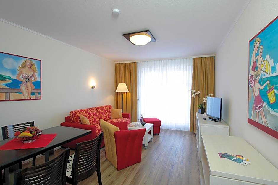 The room has 2 double beds in 2 separate bedrooms and a living room.