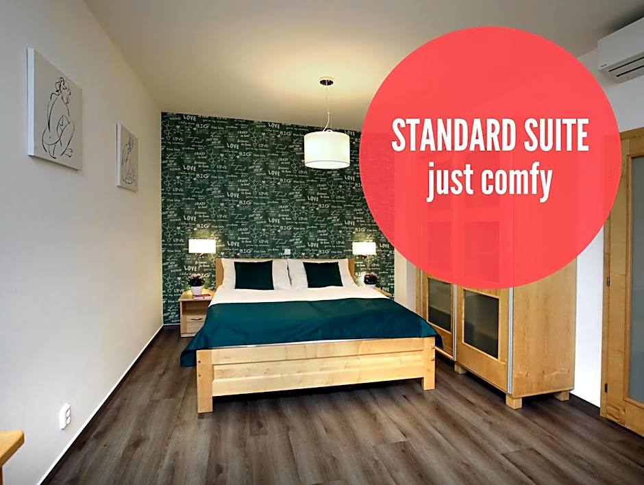 Studio features a handmade furniture, fully equipped kitchenette and air conditioning. Windows are facing the Nádražní street. One of the studios is located in the attic. A washing machine is available upon request.