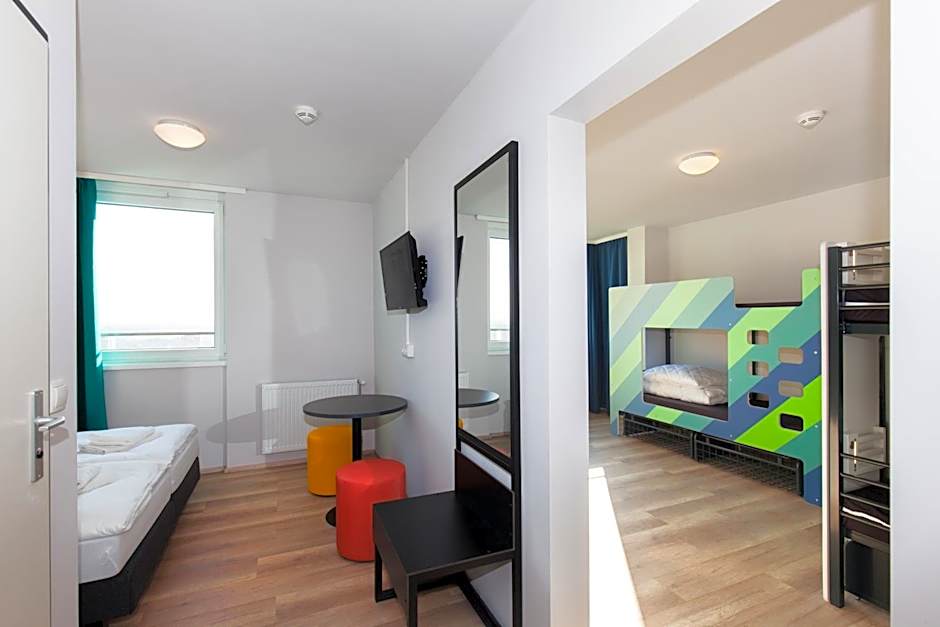 Functionally furnished room with a TV, consisting of 2 interconnected bedrooms and a private bathroom with a shower. Some rooms offer views of the city. For the bunk beds bed linen is provided for self-covering.