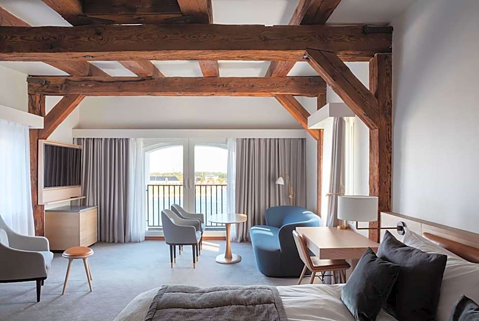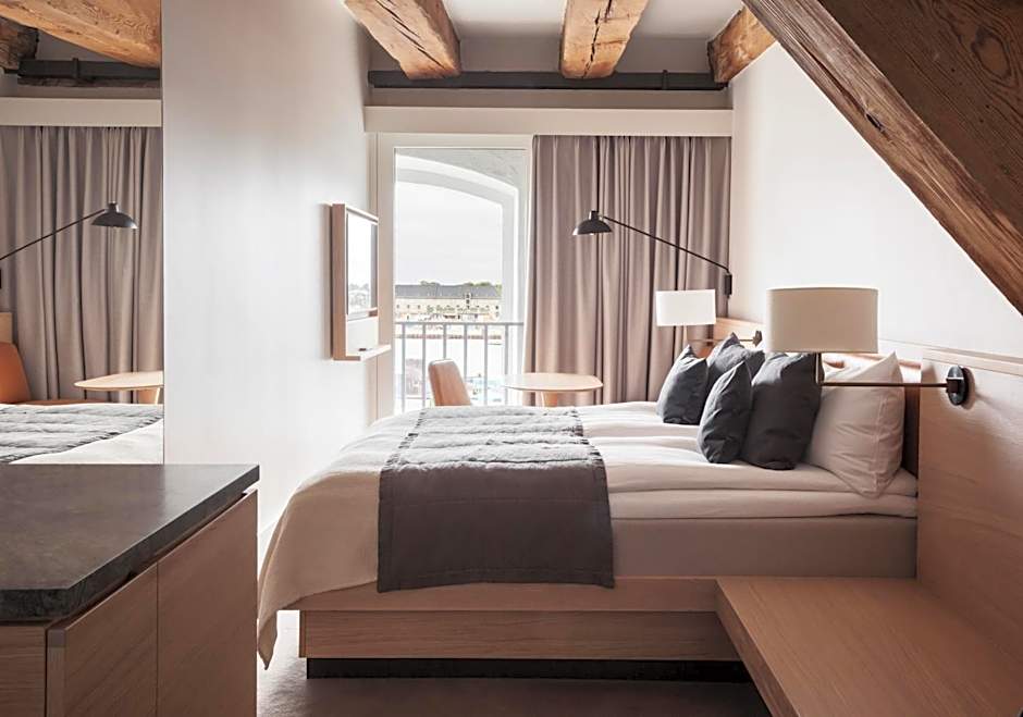 The Deluxe rooms overlooking the waterfront has large bright windows, historic wooden beams, and views of the Royal Opera and the Playhouse. The interior is elegant, Scandinavian and minimalist-modern. • Spacious floor plan and a beautiful waterfront view • Air condition and a ventilation system • Free Wi-Fi • Bathroom with specially lit mirrors, rain shower, toiletries, hairdryer and Bluetooth speakers • Bed (180 x 79 in) with hypoallergenic duvets and pillows • Safety box, ironing board/iron and shoehorn • Large TV with build-in Chromecast and Bluetooth • USB ports and light dimmers by the bed • Bring one child up to the age of 3 for free • Daily cleaning • Mini-bar • Room service • Dry cleaning service • Nonsmoking