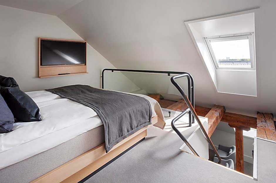 The Duplex Loft is consisted of of two stories over 33 square yards, divided by a staircase. The sleeping area is on the top floor, while the ground floor features a cozy seating arrangement. The loft has bare wooden beams and views of Copenhagen Harbor or the city’s rooftop. The sofa on the ground floor sleeps two children. • Two floors and beautiful views, either of the waterfront or the city’s rooftops • Air condition and a ventilation system • Free Wi-Fi • Bathroom with specially lit mirrors, rainshower, toiletries, hairdryer and Bluetooth speakers • 180 x 79 in bed with hypoallergenic duvets and pillows • 120 x 79 in pull-out bed with hypoallergenic duvets and pillows • Safety box, ironing board/iron and shoehorn • Two large TVs with build-in Chromecast and Bluetooth • USB ports and light dimmers by the bed • Daily cleaning • Mini-bar • Room service • Dry cleaning service • Free coffee/tea • Nonsmoking