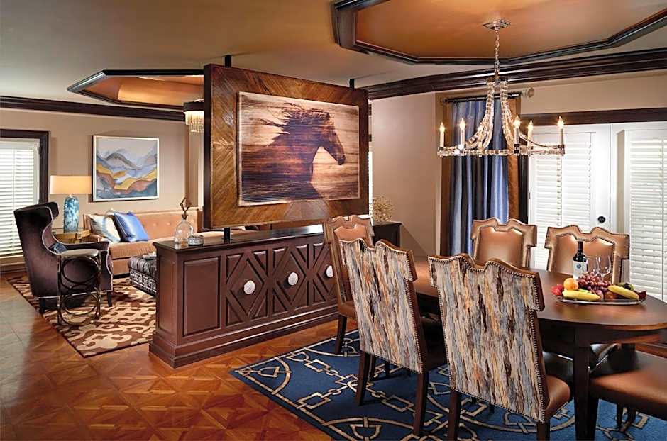 Elegant suite that includes a seating area, cable and satellite TV, and a mini-bar. A hairdryer is included in the bathroom.