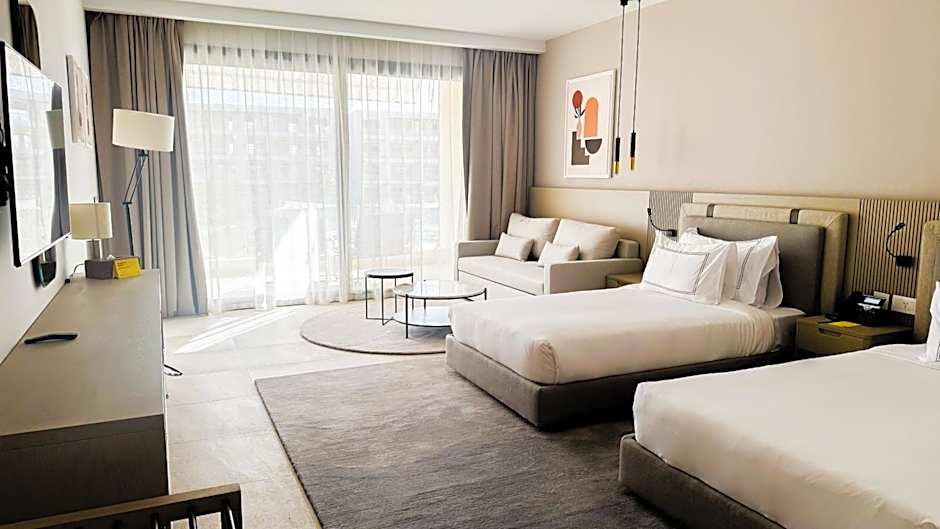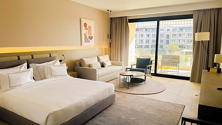 Dining options offer variety with The Fore serving Mediterranean and International flavors in settings ranging from FamilyFriendly to Romantic, The Beach Bar presenting International cuisine in a Traditional vibe, and Pizzeria Luca delivering Italian fare in FamilyFriendly, Modern, and Romantic atmospheres. Added conveniences include a kitchenette and free toiletries, beach umbrellas and loungers, and terrace access, while room service, a fitness center, and access to meeting/banquet facilities, a spa, and a golf course carry extra charges.