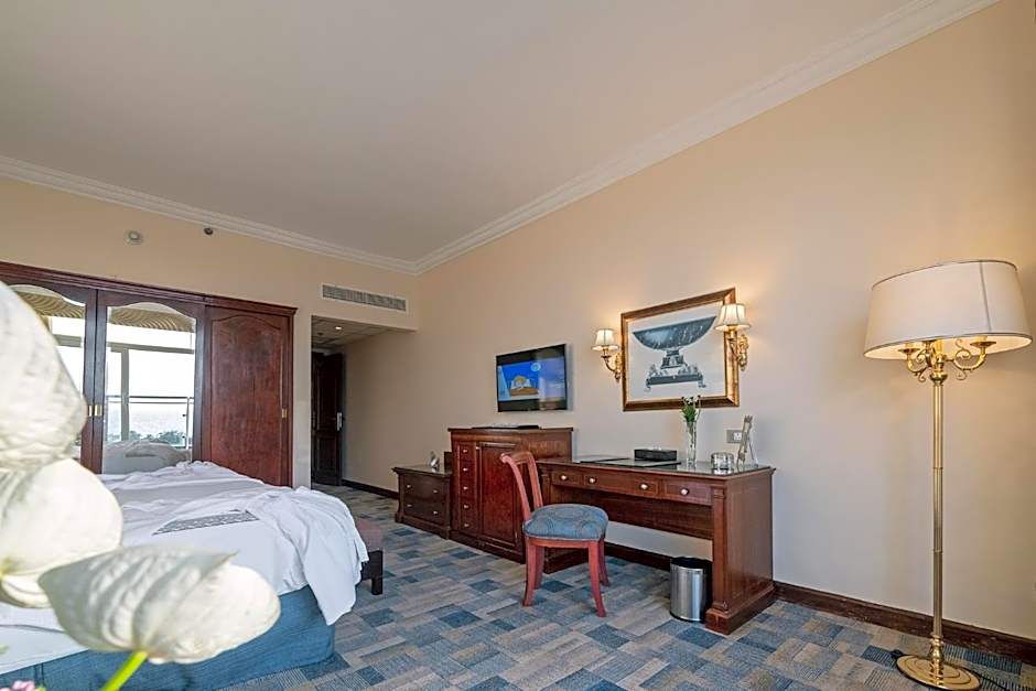 This Suite is featuring a balcony, and consists of a dining area and a living room. This suite includes a king-size bed room with connected bathroom, in addition to guest's bathroom.