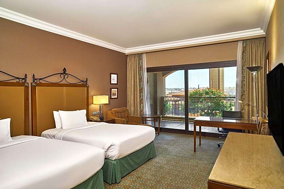 The Hilton Alexandria King's Ranch Hotel offers a variety of room types including Two Queen Beds Family Rooms, Executive Twin Rooms, Deluxe King Rooms, King Family Rooms, and One-Bedroom King Suites. The rooms range in size from 431 sqft to 807 sqft and accommodate either triple or quadruple occupancy. Smoking is not allowed in any of the rooms, and bed sizes vary, including double, king, and twin beds.