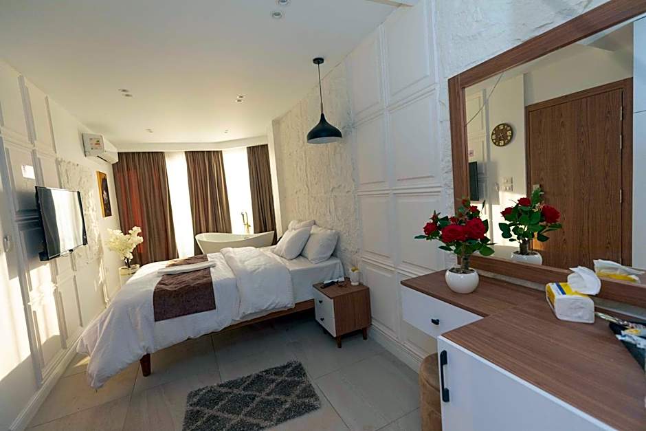 The hot tub and fireplace are the standout features of this triple room. Featuring free toiletries, this triple room includes a private bathroom with a shower, a bidet and a hairdryer. The spacious air-conditioned triple room features a flat-screen TV with streaming services, a private entrance, soundproof walls, a mini-bar as well as city views. The unit has 3 beds.