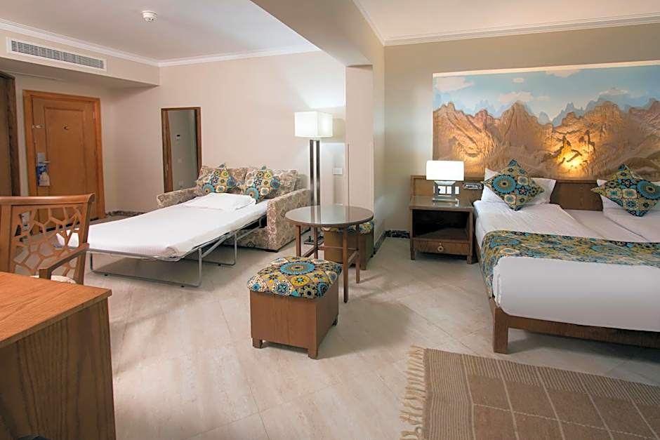 The Swiss Inn Resort Dahab offers single rooms with garden or sea views, which can accommodate 1 adult. There are also triple rooms with garden views, which can accommodate 3 adults, and family rooms with either garden views or sea side views, accommodating 3 adults. The hotel also has a standard garden view room that can accommodate 2 adults. All rooms are non-smoking and have different bed sizes including twin, queen, king, and sofa bed. The largest room available is the deluxe suite with sea view, accommodating 2 adults.