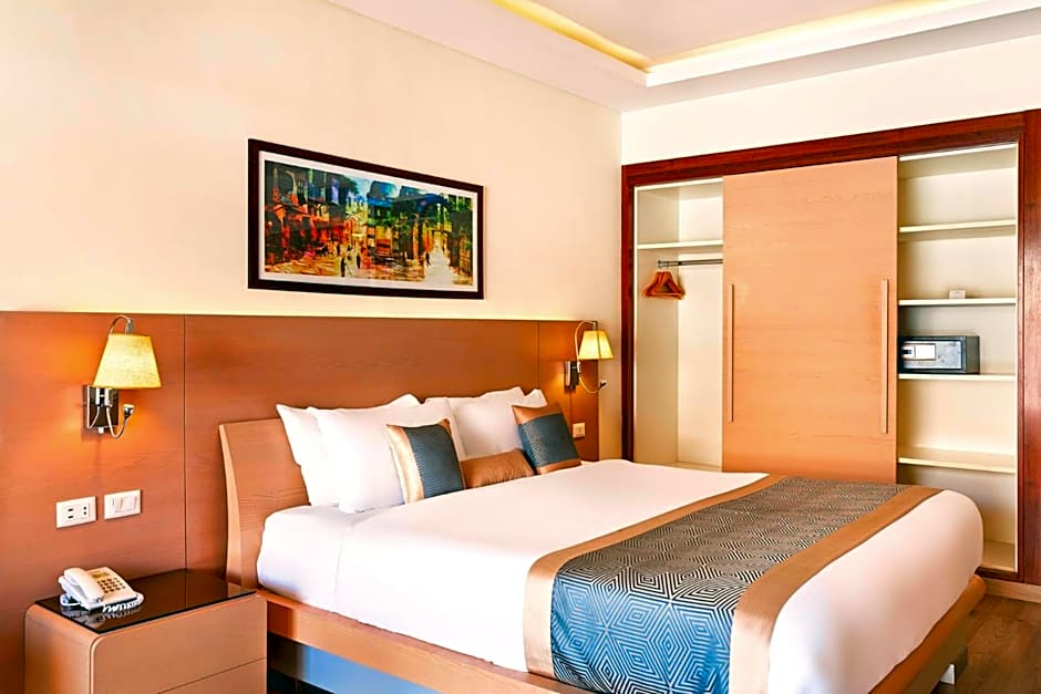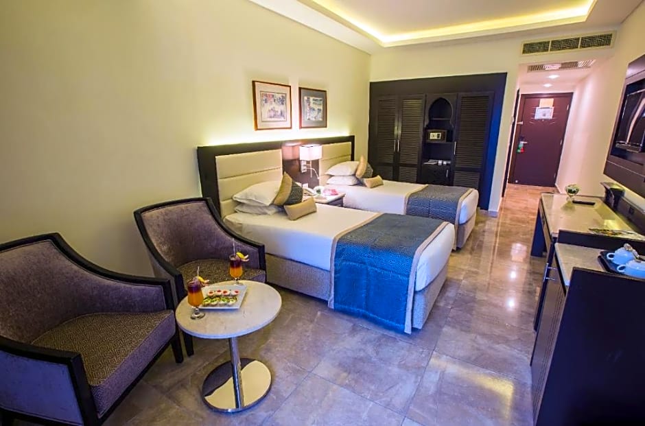The hotel offers several dining options with a range of cuisines. The restaurants on site include Le Marche, offering international cuisine, La Casa with Italian cuisine, L’Asiatique serving Asian dishes, and Tagine specializing in Middle Eastern cuisine.